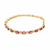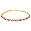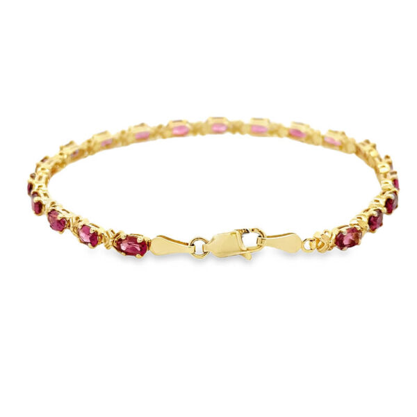 Indulge in the subtle elegance of this gold tennis bracelet, featuring a series of oval faceted rhodolite garnets. The pinkish-red gems are meticulously set, creating a harmonious blend of color and light. Ideal for adding a touch of sophistication to any ensemble.