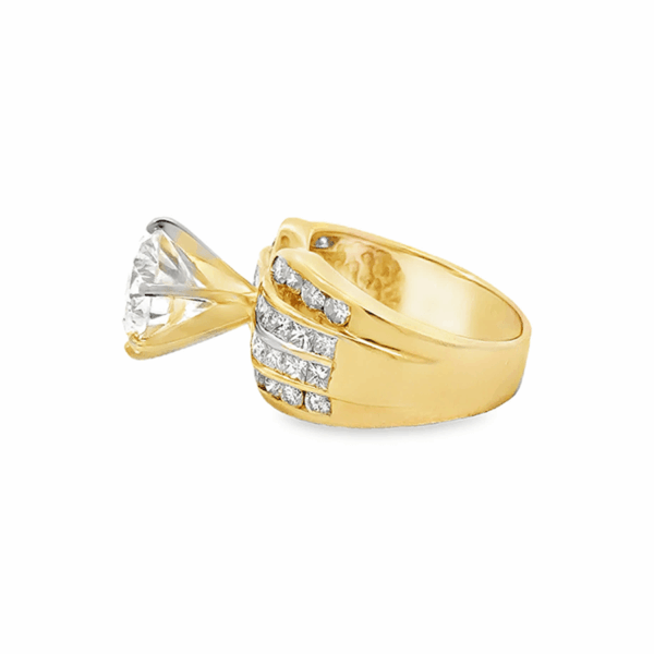 Elevate your style with this captivating 14k yellow gold engagement ring. The centerpiece is a 4.06ct brilliant round cut diamond, exuding exceptional fire and brilliance. There is another 3.20ct in accent diamonds set within this beauty, bringing the total diamond weight to 7.26ct tw! This ring showcases exquisite craftsmanship and timeless elegance, making it a treasured addition to any jewelry collection.
