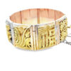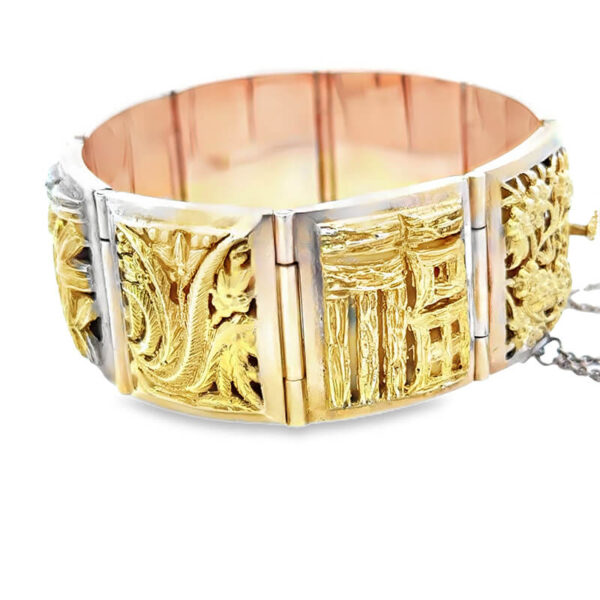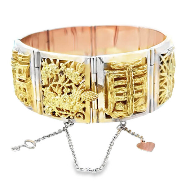From the estate of a woman who grew up in Guam and Korea, elevate your wrist with this exquisitely crafted vintage rose and yellow gold Chinese Four Seasons bangle. The intricate openwork design showcases a captivating blend of symbolic motifs and floral details, embodying both artistry and tradition. This eye-catching accessory adds a touch of refined elegance to any ensemble.