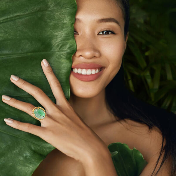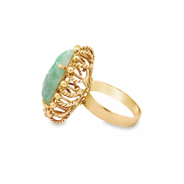 Elevate your style with this distinctive gold cocktail ring, featuring an oval carved jade. The smooth, gently rounded surface of the green jade showcases natural variations in tone. This statement piece combines classic elegance with the unique charm of natural jade, perfect for adding a touch of unique style to any ensemble.