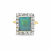 Capture timeless elegance with this vintage-inspired opal and diamond cocktail ring. The focal point is a captivating square cabochon opal, showcasing a mesmerizing bluish green play of color. Set in radiant yellow gold with single cut diamond accents, this ring exudes sophistication and charm, making it a statement piece for any occasion.